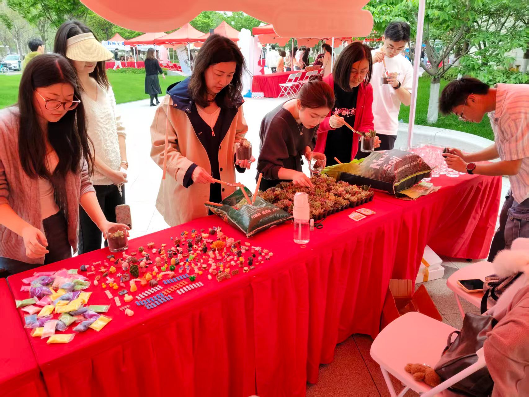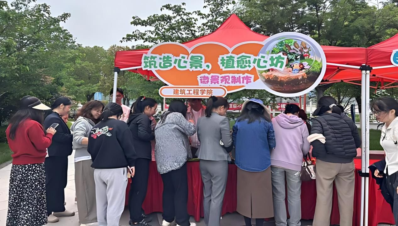 “心向阳”心理发展工作室在南区食堂广场开展“筑造心景,植愈心坊”微景观制作活动。